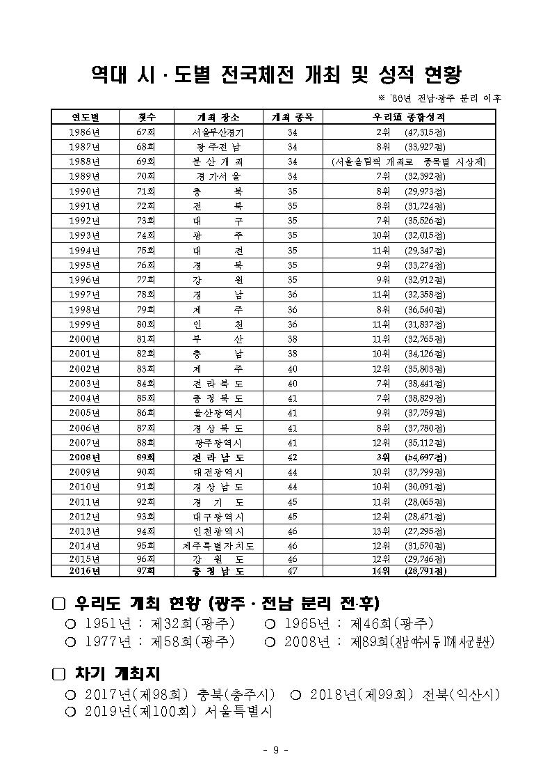 | 12 | 역대 시·도별 전국체전 개최 및 성적 현황 | 관리자 | 2017-01-05 | 8622 |